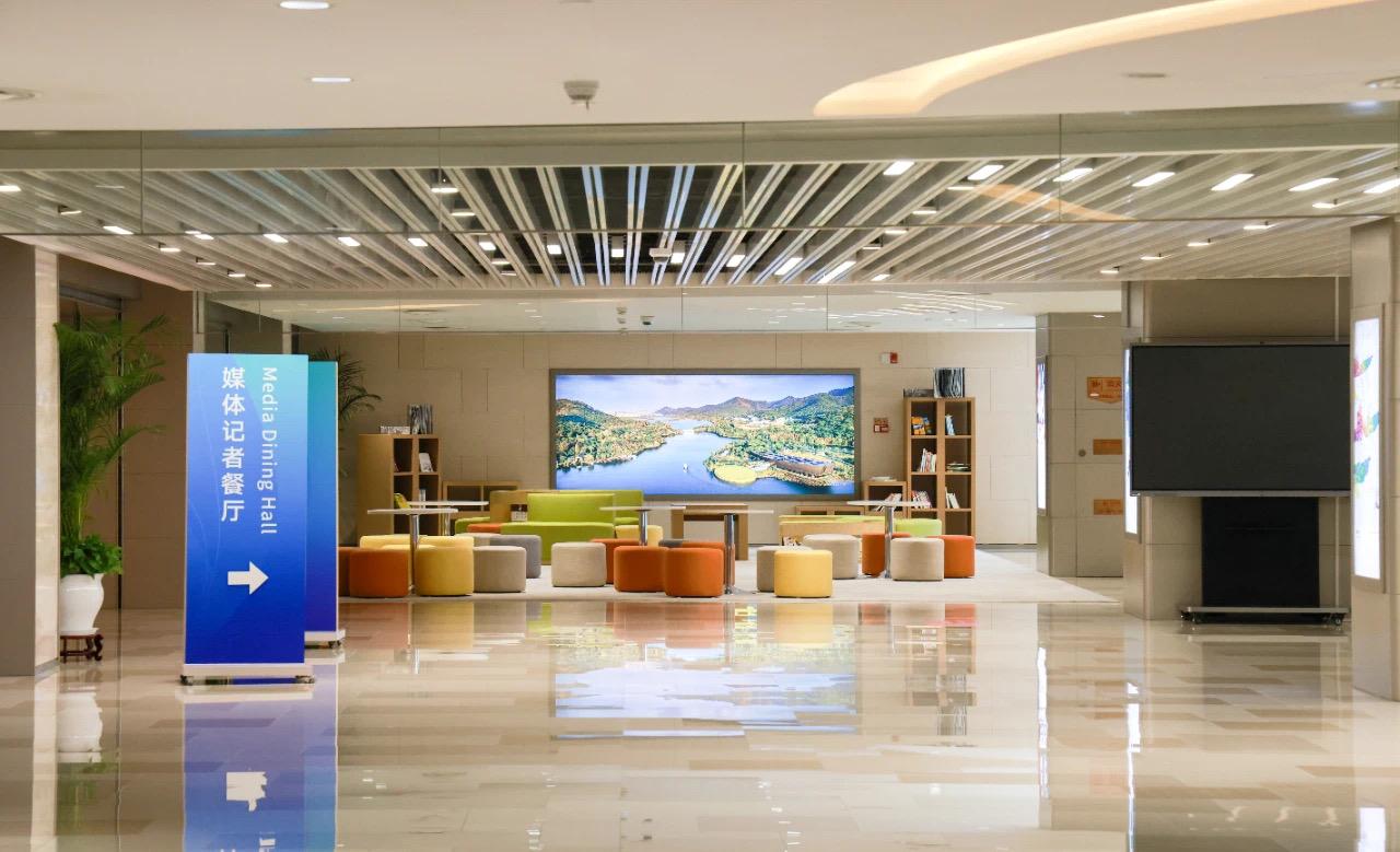 杭州亚运会主媒体中心(MMC)位于杭博一层,使用四个展厅及序厅,总面积5万平方米。用于接待媒体记者与工作人员的用餐区设置于展厅负一楼,面积约1万平方米,设有餐位近2000座。