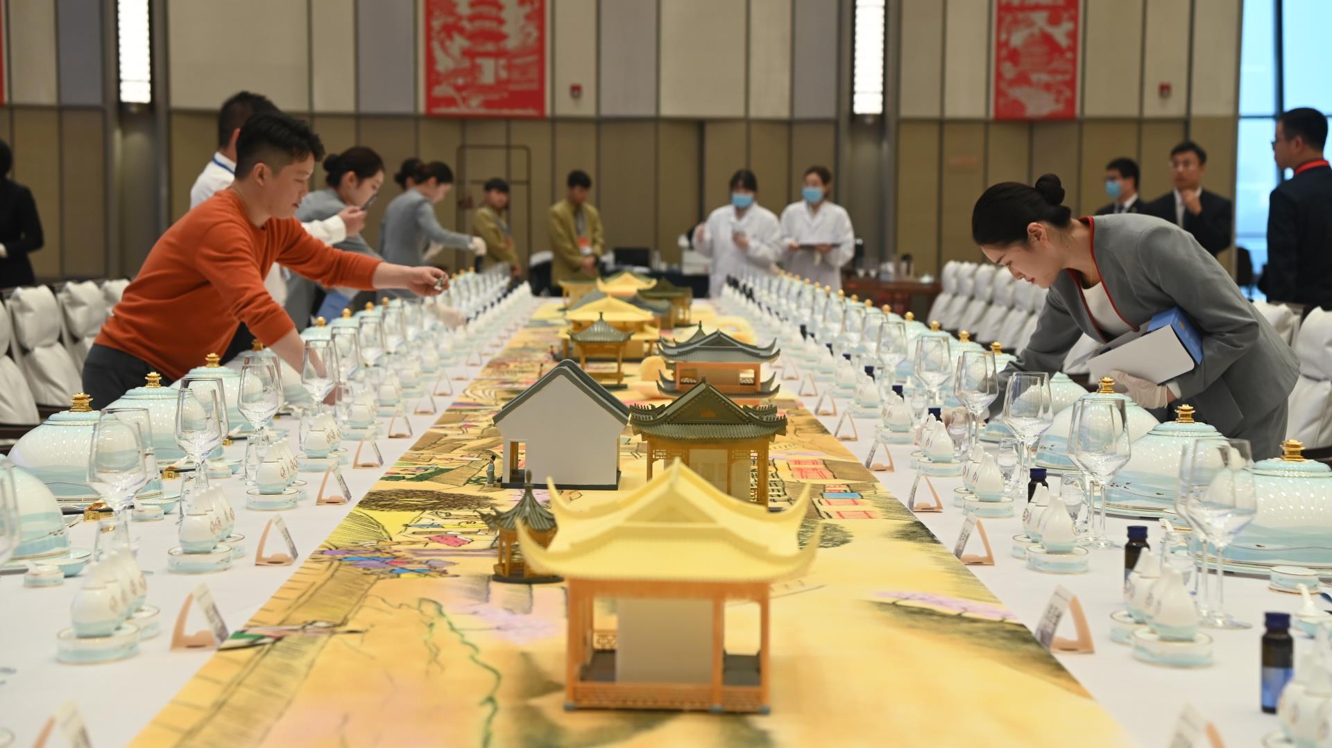 为晚宴独创的扬子迎客菜单,采用印谱的形式,所有菜名均设计为形状各异的创意印章,辅之以洒金纸和非遗线装书装裱工艺,既寓意了“心心相印”又达到了“美誉金陵”的宣传效果,用餐结束后70%的菜谱被嘉宾带走收藏;在菜品创意上,独创的“翠玉白菜 微笑·瓦当”甜品,灵感来自于台北故宫博物院的重要文物“翠玉白菜”和用瓦当形状展现的拥有浓厚南京文化的“六朝的微笑”,巧妙地将台北文物与南京特色文化相呼应,寓意着两岸“同宗同源”和“金瓯无缺”;创意桌案以《南都繁会图》为整体装饰内容,用沙画和3D打印技术再现繁盛金陵,呼应两岸企业家携手振兴中华民族经济的美好愿望。