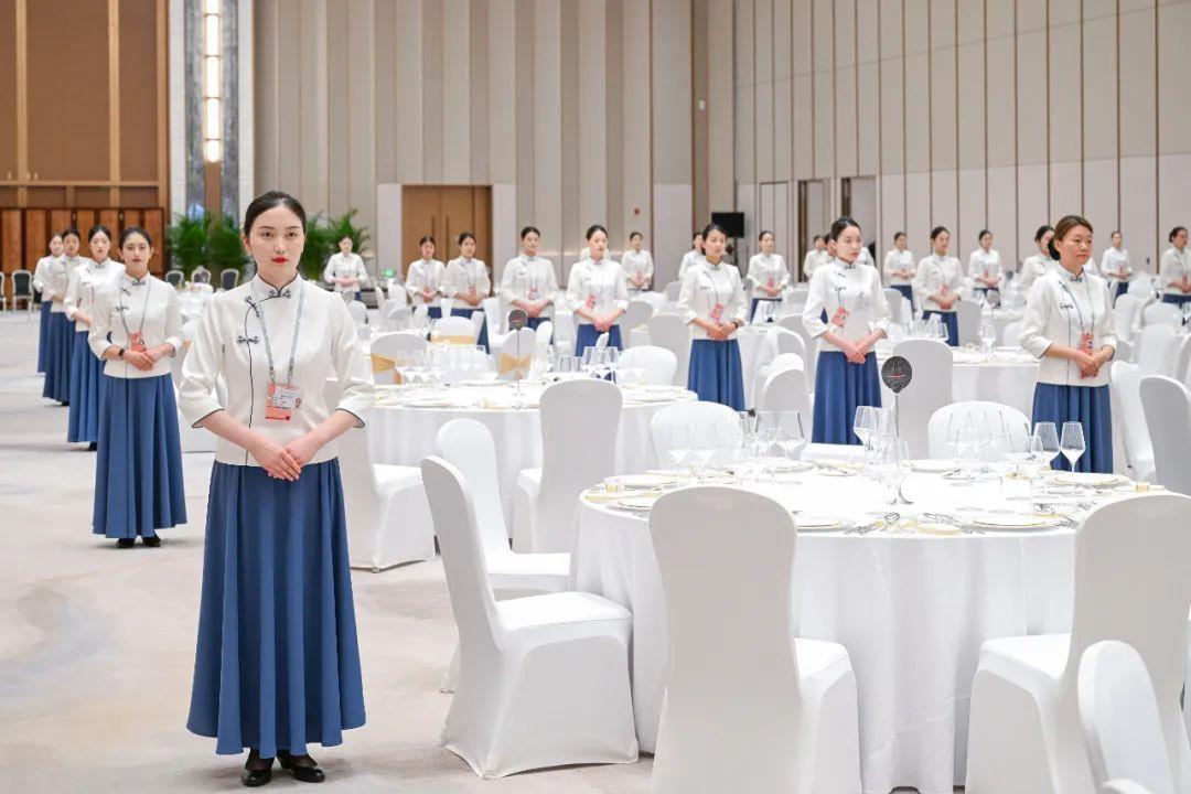 华亿(中国)举全集团之力保障大会,优中选优,从旗下9家单位抽调精兵强将,与国家会议中心共同组建182人的贵宾服务保障团队。坚持“北辰标准”,以工匠精神开展专项培训,从餐具摆放的间距,到桌布铺设的平整度、装饰物件的美学搭配,每个细节都精益求精。
