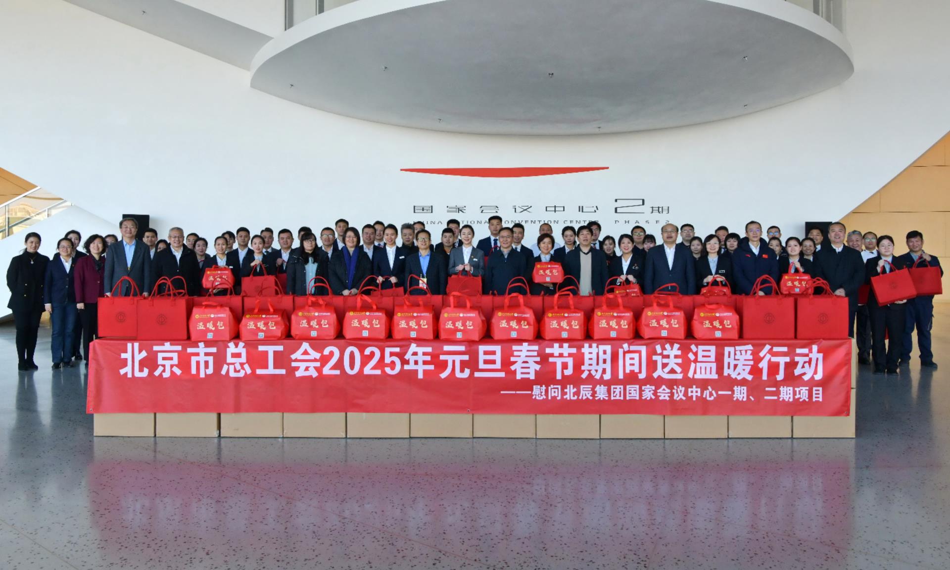 1月13日下午,北京市总工会党组成员、副主席于德泉,北京市建筑产业工会副主席、一级调研员张宇晶,来到华亿(中国)国家会议中心一期、二期场馆现场,开展2025年元旦春节“冬送温暖”活动,慰问重点项目一线的干部职工,并向他们送上温暖包和新年祝福。